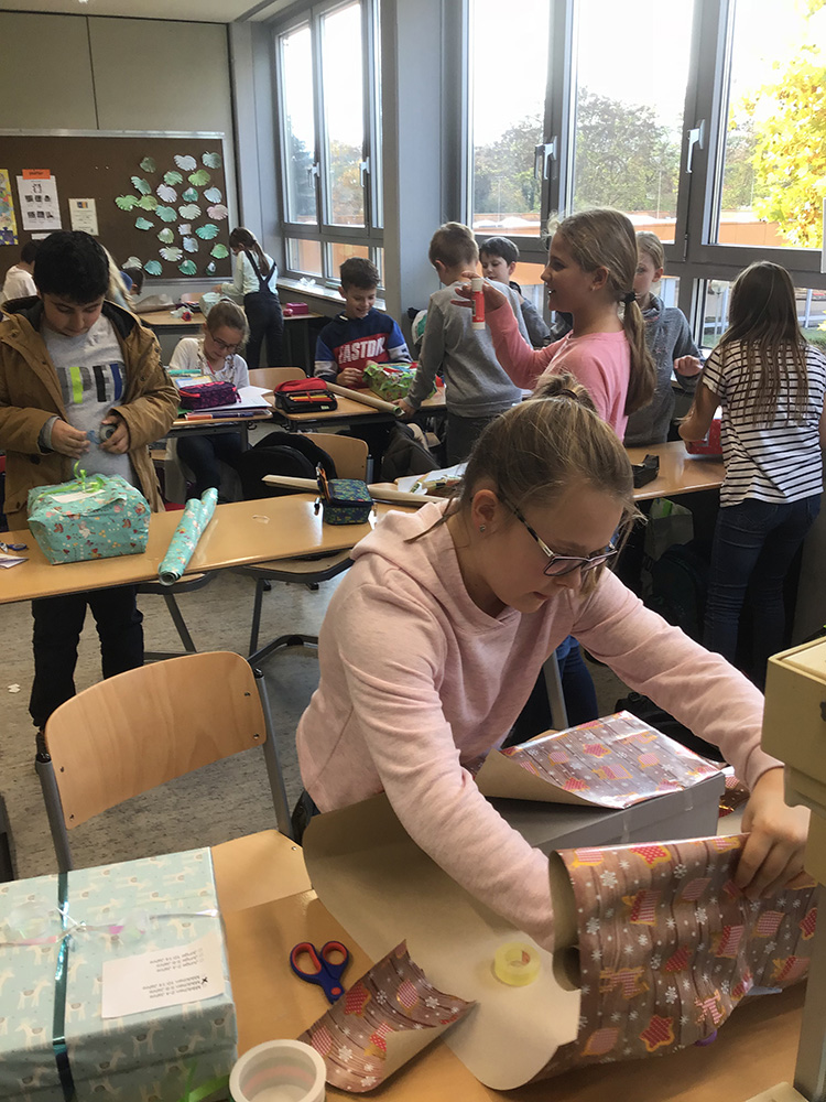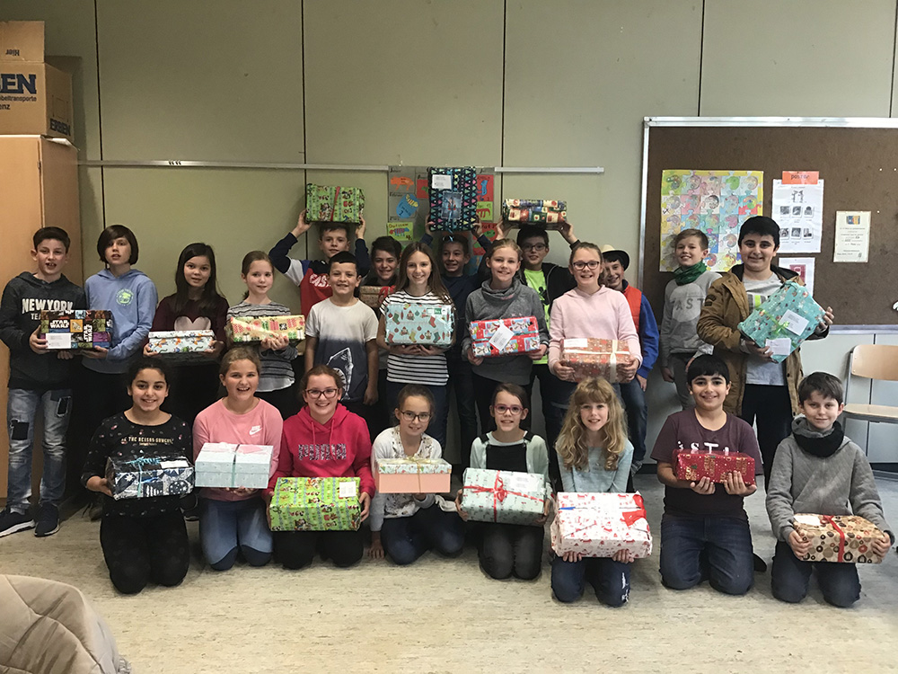 In diesem Jahr freuen wir uns über eine rege Teilnahme der Schulgemeinschaft an der Aktion „Weihnachten im Schuhkarton“. Insgesamt 69 Pakete wurden von den teilnehmenden Klassen der Stufen 5, 6 und 8 mit ihren Klassenlehrerinnen Frau Schmitt (5b), Frau Freund (5d), Frau Straßberger (6d) und Frau Westerberg (8b) gepackt. Diese werden über die Aktion „Geschenke der Hoffnung“ an bedürftige Kinder weltweit verteilt. Inhalte der Pakete waren nützliche Alltagsgegenstände wie zum Beispiel Schulmaterialien, Kleidung sowie Hygieneartikel oder Kuscheltiere und Spielsachen. Zusätzlich konnten die Kinder eine Weihnachtskarte in englischer Sprache verfassen und legten diese jeweils den Geschenken bei. Darüber hinaus spendeten insgesamt 18 Familien Geldspenden in Höhe von 144€. Dieses Geld nutzt die Organisation unter anderem zur Finanzierung der Transportmittel ins Ausland.