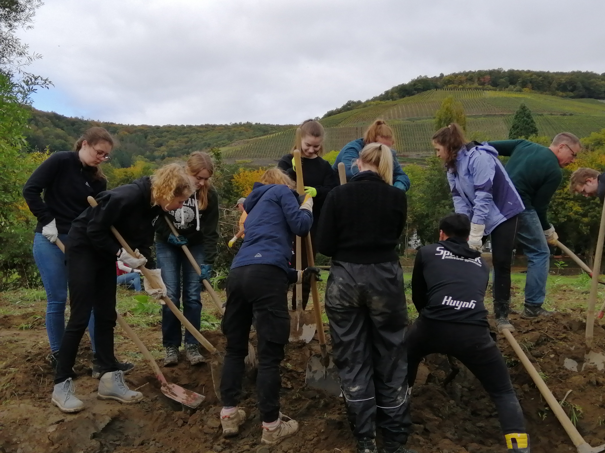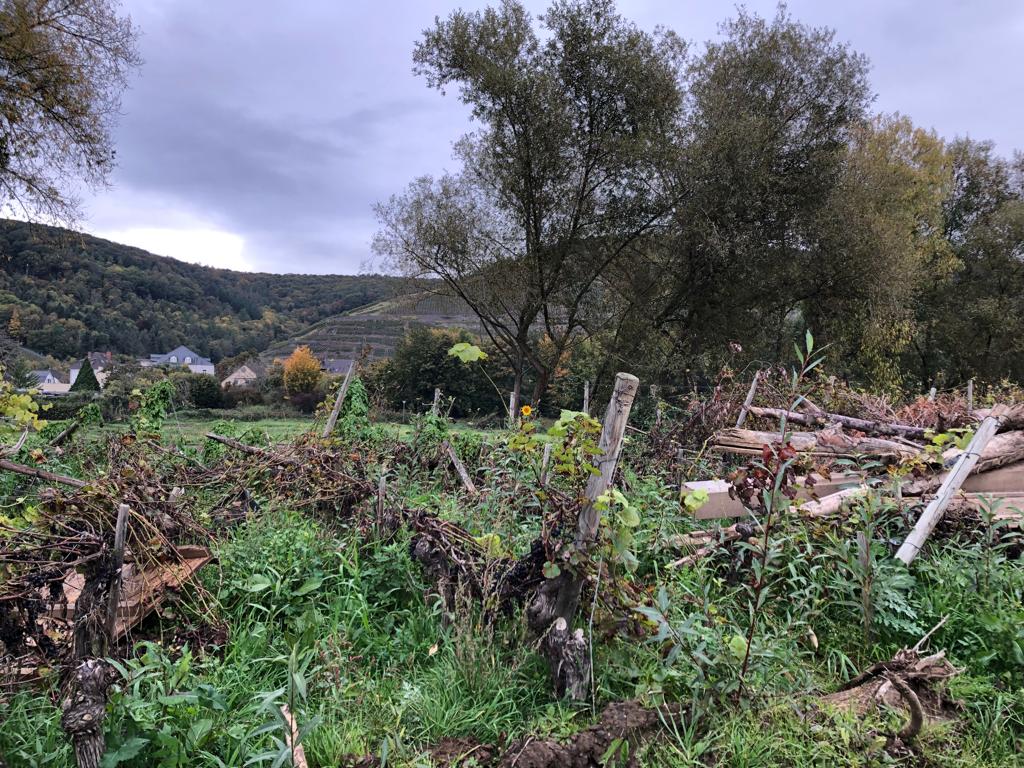 Dort arbeitete die Gruppe des Mittelrhein-Gymnasiums mit weiteren 90 freiwilligen Helferinnen und Helfern zusammen. Nach einer kurzen Einweisung vor Ort packten alle gemeinsam an. Die zugewiesene Aufgabe bestand darin, ein Weinfeld von Gerümpel zu befreien und wieder für den Weinanbau nutzbar zu machen.