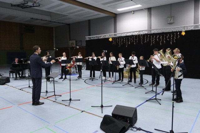 Mit den Klängen des Bläserensembels der Lehrkräfte wurde das diesjährige Weihnachtskonzert am 15. Dezember 2022 in der festlich geschmückten Schulsporthalle eröffnet.
